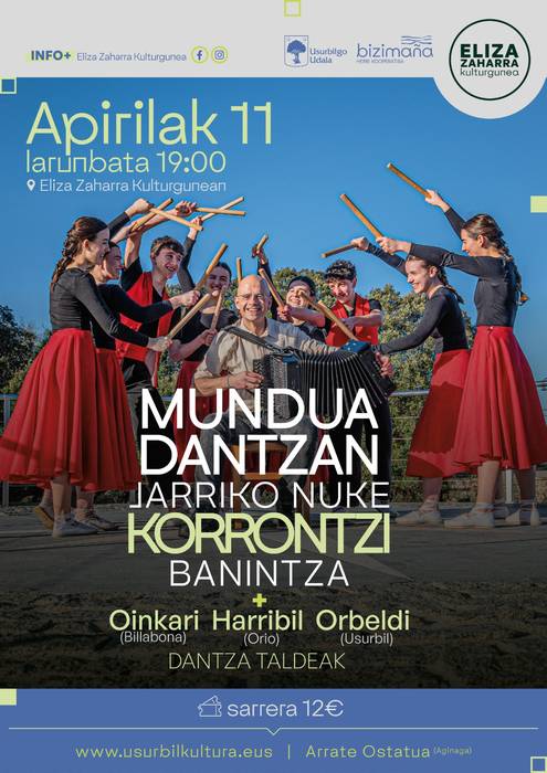 Ordua: 19:00.Tokia: Aginagako Eliza Zaharra Elkargunea.Zehaztasunak: "Mundua Dantzan jarriko nuke" emanaldia eskainiko dute Korrontzi banintza, Oinkari (Billabona), Harribil (Orio) eta Orbeldi (Usurbil) dantza taldeek.Sarrerak: 12 eurotan aurrez usurbilkultura.eus plataforman edo Aginagako Arrate Ostatuan.Antolatzailea: Aginagako Eliza Zaharra Elkargunea.