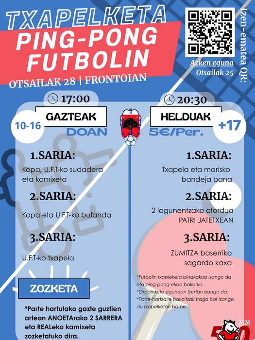 Usurbil F.T.-k 50 urte: ping-pong eta futbolin txapelketakTokia: Usurbilgo frontoia.17:00-19:30 Gazteak (10-16 urte artekoentzat):1. saria: kopa, Usurbil F.T.-ko sudadera eta kamiseta.2. saria: kopa eta Usurbil F.T.-ko bufanda.3. saria: Usurbil F.T.-ko txapela.Prezioa: doan.20:30-23:00 Helduak (17 urtetik gorakoentzat):1. saria: txapela eta marisko bandeja bana.2. saria: bi lagunentzako otordua Patri jatetxean.3. saria: Zumitza baserriko sagardo kaxa.Prezioa: 5 euro, egunean bertan.Izen emateko azken eguna: otsailaren 25a.Izena emateko moduak:-Presentzialki: otsailaren 24an, 17:30etatik aurrera, Usurbilgo frontoian.-Telematikoki: Usurbil F.T.-ren txapelketakOharrak:-Futbolin txapelketa binakakoa izango da eta ping-pong-ekoa bakarka.-Ordainketa egunean bertan izango da.-Parte-hartzaile bakoitzak trago bat izango du txapelketaren barne.-Parte hartutako gazte guztien artean, Anoeta futbol zelairako bi sarrera eta Realaren kamiseta zozketatuko dira.Antolatzailea: Usurbil F.T.