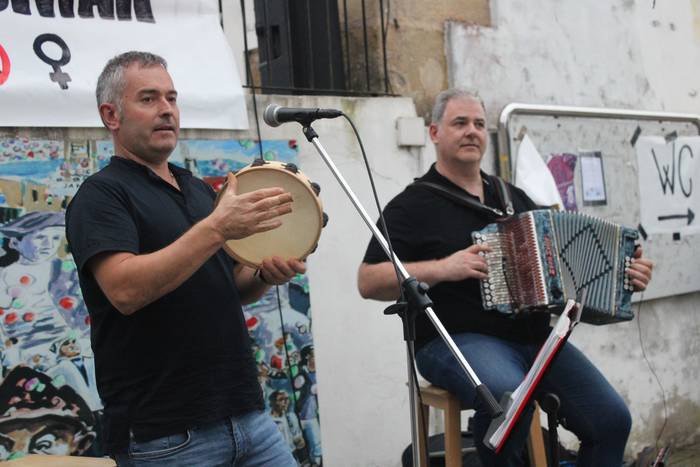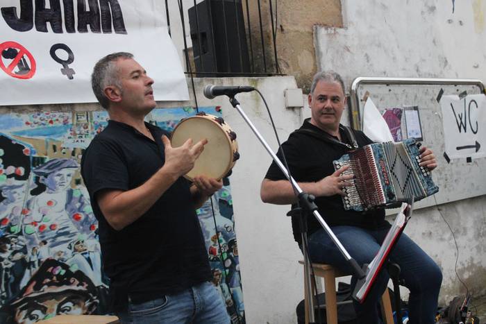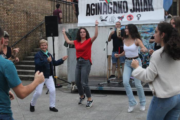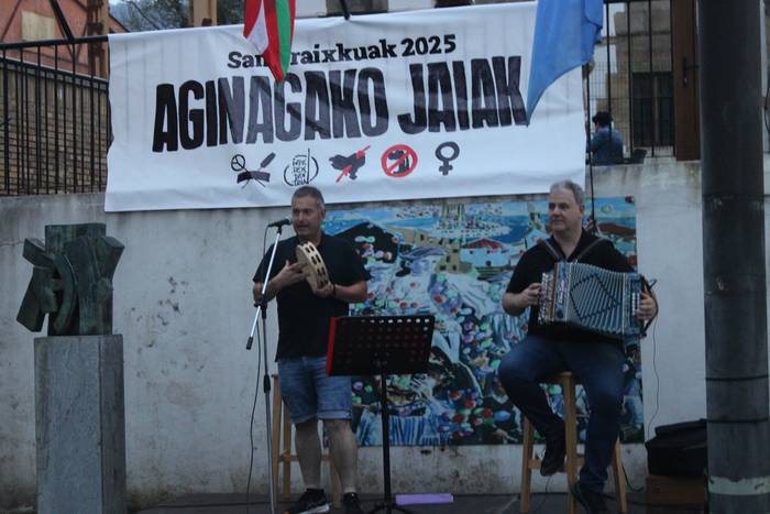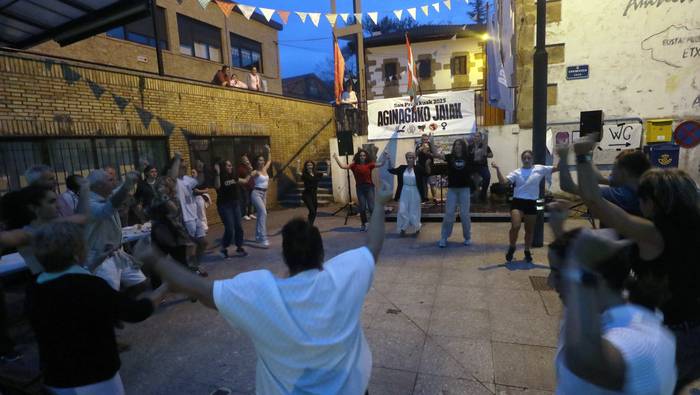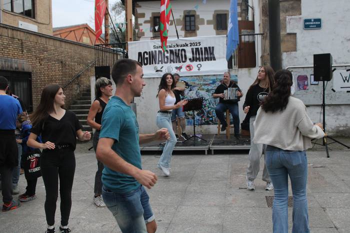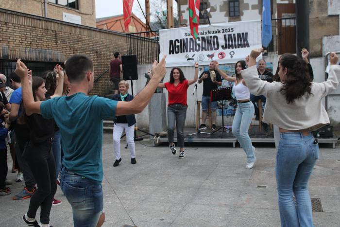 Iaz ere festen hasierara eraman zuten hitzordu hau eta aurten, irudi bera errepikatu da. Dantza batean jarri dituzte festak eta festazaleak, San Praixkuen lehen orduetan. Jon Ostolaza herrikidea eta Andoni Larrañaga aritu dira dantza giroa pizten Aginagan. Baita lortu ere, jendea dantzara gonbidatzea. Eta, a zer nolako dantzarako trebetasuna erakutsi duten.