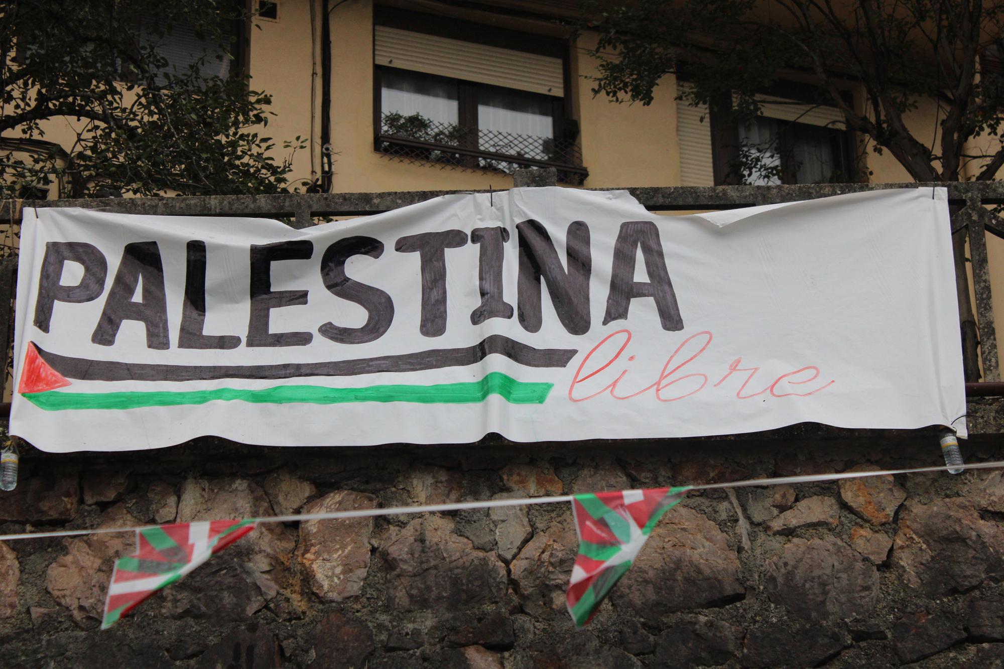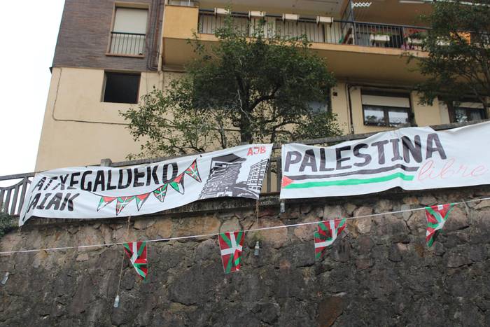 "Palestina libre" nahi dutela aldarrikatzen ari dira amaitzear diren Atxegaldeko jaietan. Aipatu herriko banderarekin batera biltzen duen pankarta eseki dute festen erdigunea den auzoko plazan. Hurrengo egunotan aldarriok plaza ugari hartuko dituzte.