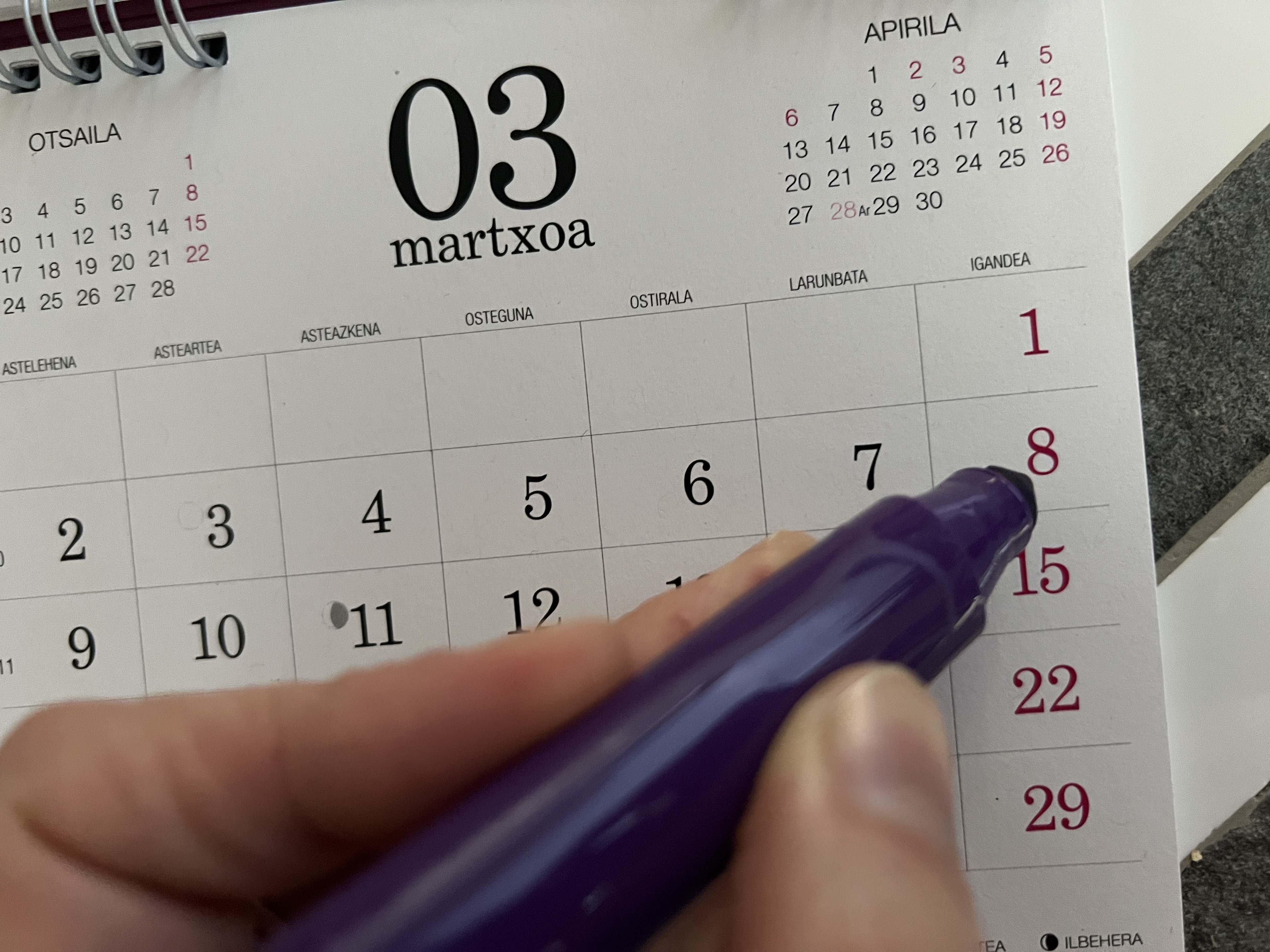 Egutegian duen kolore beltza aldatu diezaiokegu, baina ez gorria jartzeko, more gorrixka baizik. Moreari gorria gehitzea da gakoa, ez bere horretan gorri bihurtzea. Eta zein da aldea? Gorri soila izatearen ondorioz gerta daiteke dendak itxita eta kaleak hutsik egotea, edo zubia egokitzen den urtean “kanpora” joateko baliatzea. Jaiegun hil bat. Horrelako egun gorri batzuk baditugu. More gorrixka baldin bada, ordea, gorriaz eta jaiaz gain, morea eta aldarrikapena ere badaudela esan nahiko du. Eta kaleak beteta mantendu behar ditugula gogoratuko dugu. Kalera atera eta berdintasunaren aldeko oihuak entzungo dira ozen. Emakumeon indarra ikusiko da, eta elkartzen garenean sortzen den energia zabalduko da.