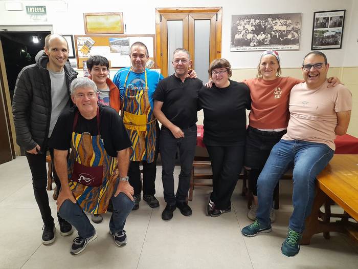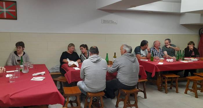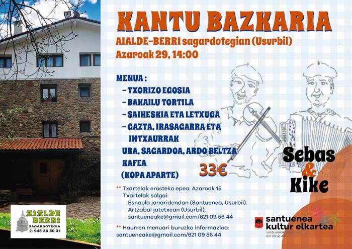 14:00 Kantu bazkaria Aialde-Berri sagardotegian. Sebasek eta Kikek girotuko dute. Menua: txorizo egosia, bakailu tortila, saiheskia eta letxuga, gazta, irasagarra eta intxaurrak. Ura, sagardoa, ardo beltza, kafea. Kopa aparte. Prezioa: 33 euro.