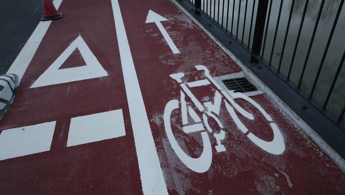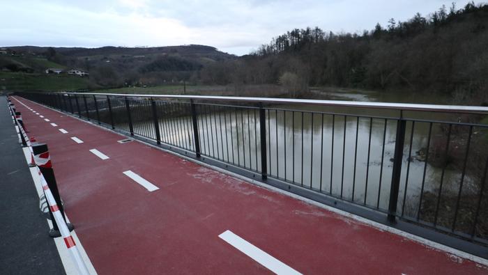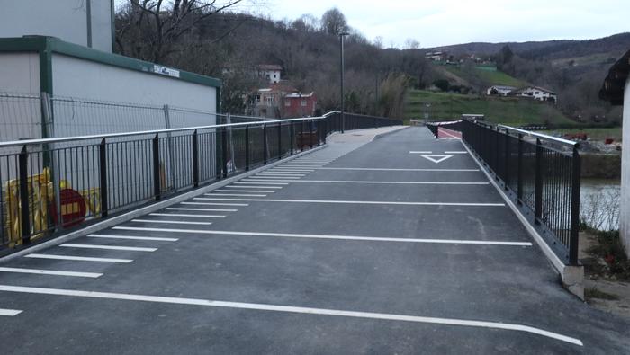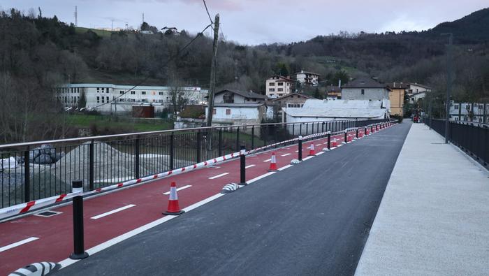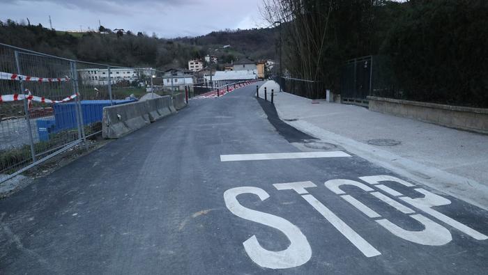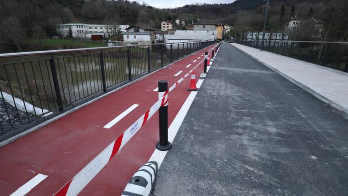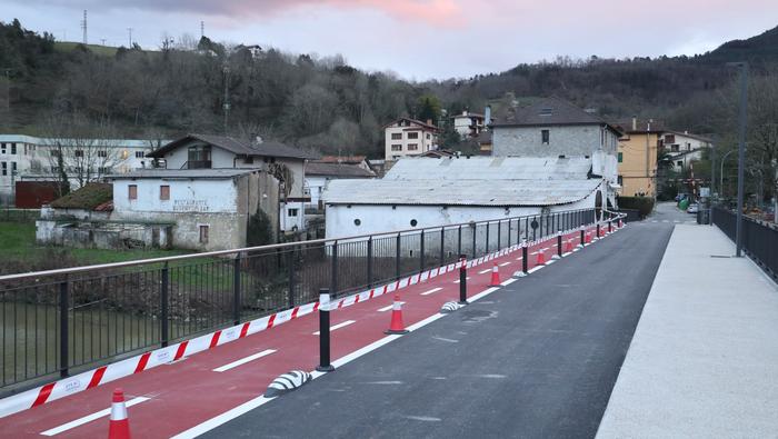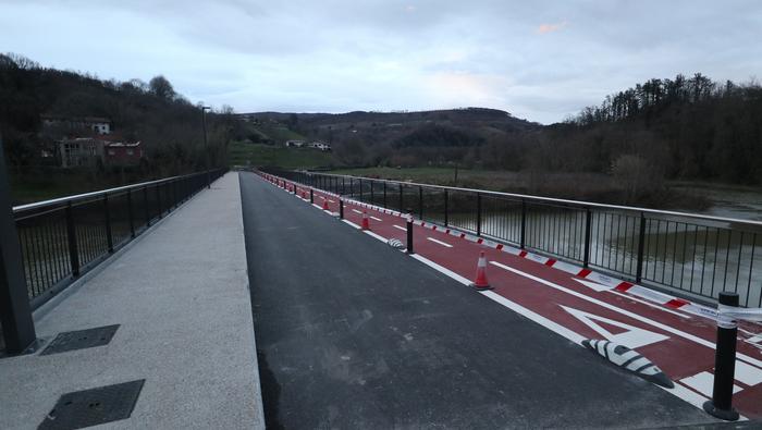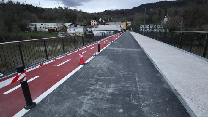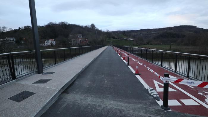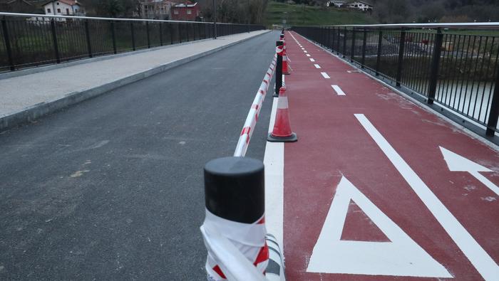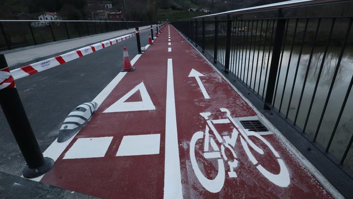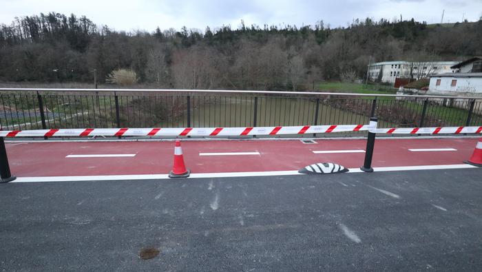 Zubiaren beste aldean, bidegorria egokitu dute. Ostiral arratsalde honetan, ordea, oraindik zigilatua zuten eremu hori. Bidegorri horretako lurzoruko marra zuriak margotu berriak zituzten eta momentuz, aipatu moduan ez dago erabiltzeko moduan, aipaturiko zubiko gainerako eremuak bai.