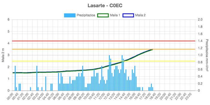 Azken asteotan bezala ostegun honetan ere ez da giro. Abenduaren bederatzigarren honetan ere euria barra-barra, baino aurreko egunotan baino indar gehiagoz. Alerta laranjan gara "prezipitazio iraunkorragatik". Eta datozen orduotan are gehiago bota dezake. Eta euritan botatakoa nabari du errioak. Arratsaldeko 14:30ak pasatxoan maila horira heldu da eta 18:00ak pasatxoan maila laranjara. Ikusi Euskalmet meteorologia agentziak helarazitako azken datuak; Lasarte-Oriako estaziokoak. Berde koloreko marrak erakusten du Oriak azken orduotan izandako gorakada.