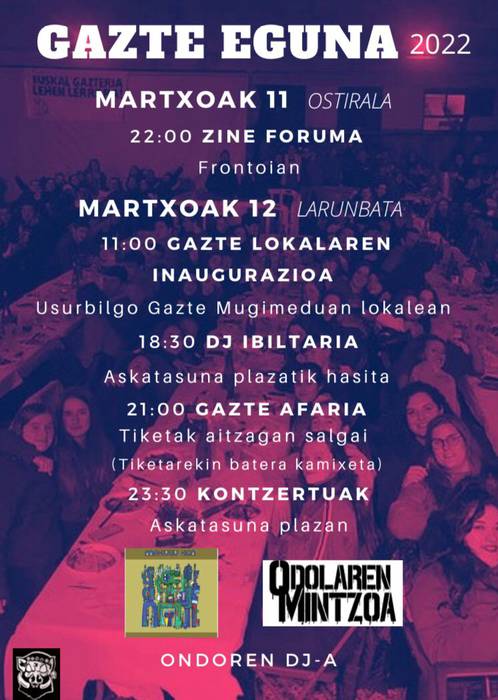 Aipatu moduan, gazte lokalaren irekierarekin batera, osasun krisialdian murgildu ginenez geroztik lehen gazte afaria antolatu dute martxoaren 12rako Askatasuna plazan. Gogoan izan, agortu ez badira, txartelak Aitzagan dituzue salgai. Txartelarekin batera, kamiseta ere eskuratu ahalko duzue.