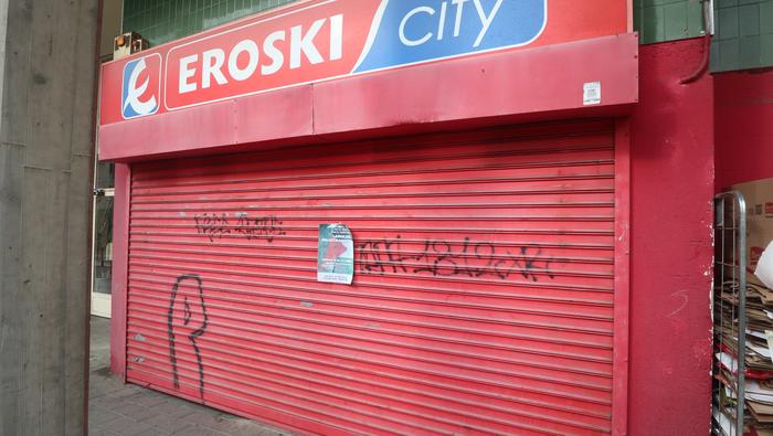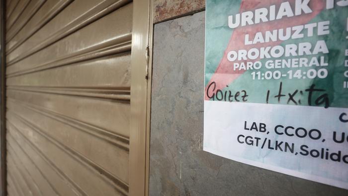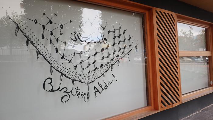 Itxitako lokalon ate eta pertsianetan sindikatuek gaurko eginiko deialdiaren kartelak itsatsi dituzte gehienek, baina sormenerako tarterik ere izan da. Ta Puntukoen egoitzan esaterako, erakusleihoan, "bizitzen alde!" lelopean sortu duten irudia.