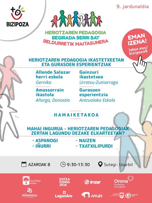 -Heriotzaren pedagogia ikastetxeetan eta gurasoen esperientziak: Allende Salazar, Gernikako herri eskola; Urretxu-Zumarragako Gainzuri ikastetxea; Añorgako Amassorrain ikastola eta Antzuolako Eskolako gurasoen esperientzia.