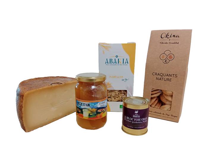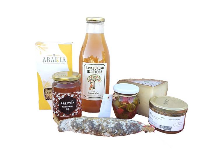 Produktuak: lukainka idorra, fusilli pasta xuriak, patea, eztia, piper ezti ozpinan, sagar jüsa, gasna biologikoa.