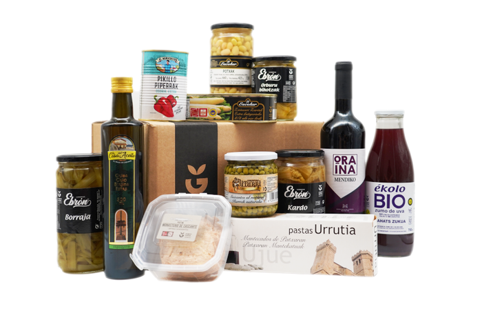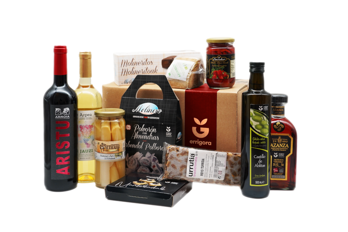 -Gorria: 75 eurotan, ardo beltza (18 hil barrikan), ardo txuria, olioa, piperrak, zainzuriak, turroia, mantekadak, polboroiak, ardi-gazta, txokolatezko molineritoak, patxarana.