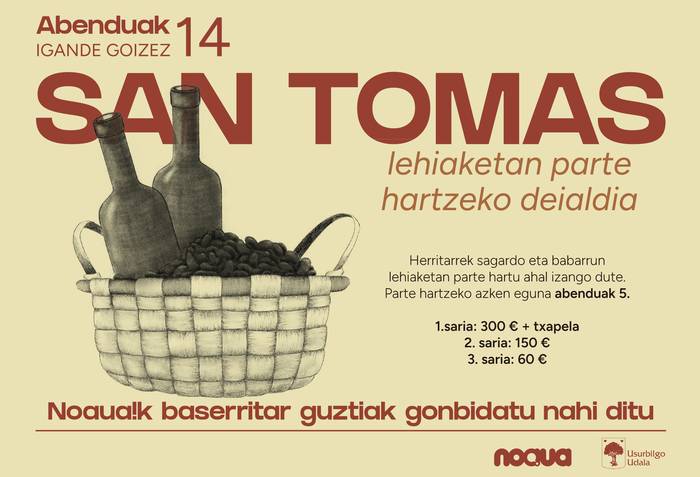 Azoken garai betean gara Usurbilen. Ziklo hau borobilduko duena NOAUA! Kultur Elkartearen San Tomas azoka izango da. Abenduaren 14rako antolatzen ari da hitzordua kultur elkarte hau. Nola ez, bada urtero moduan hutsik egingo ez duen osagaia; sagardo eta babarrun txapelketez ari gara.