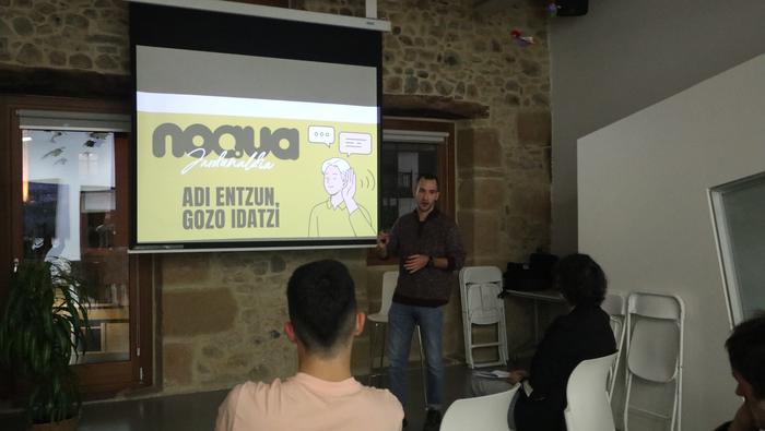 "Hausnarketarako tresnak eskaintzea" zuen xede hitzorduak eta horixe, zer pentsatua eragin zuen NOAUA! K.E.-k azaroaren 19an Potxoenean antolaturiko "adi entzun, gozo idatzi" jardunaldiak. Alfabetatze mediatikoa eta gazteekin lan egiten duten eragileen artean tresna digitalen erabilera osasuntsua sustatu nahiz gaia herriratzea izan ziren Idoia Torregaraik zuzenduriko saioaren xede nagusiak. Lehenbizi, teknologia libreak eta ekonomia sozial eraldatzailearen markoan dabiltzan enpresa eta kooperatiben bilguneko TEKS elkarteko kide Mattin Solisek hartu zuen hitza. Komunikazio burujabe baterantz jo ahal izateko hainbat gako eskaini zituen, geure datuak geure kontrolpetik kanpo helburu komertzialekin ustiatzen dituzten sareak nagusi diren garaiotan. Testuinguru horretan, webguneen erreferentzialtasuna aldarrikatu zuen. "Webguneak gure etxea izan beharko luke" eta horien bidez "tokian tokiko beharrak" lehenestearen alde egin zuen; atariok izatea komunikazio beharrei erantzuteko ereduaren abiapuntu eta, gero, "hortik bideratzea sare sozialak". Ildo horretan, onuragarritzat jo zuen "bitarteko ezberdinak izatea gure jarduna helarazteko". Horretarako garrantzitsutzat jo zuen "zer eredu sustatu nahi dugun" argi izatea, beharrak edota desioak egoki identifikatuak izatea. Sare sozial askeei erreparatu zien. Izan ere, "sare sozial bakarra izateko aukera ematen dute" eta sare bakar horretatik, gainerakoak jarraitzeko aukera, "elkar komunikatzeko aukera". Ondorioz, aukera gehiago eskaintzen ditu "sare batean egoteak hortik eragiteko". Gauza guztien antzera, aukera horrek ere baditu desabantailak, ordea; hedapen eta erabiltzaile gutxi dituzte. Komunikazio burujabe baterako gako gehiago ere gogorarazi zizkigun; alor honen kontrola izaten laguntzen duten kartelen nahiz mezularitza tresnen bidezko edota ahoz ahokoak ahalbidetzen duen hartueman zuzena.
