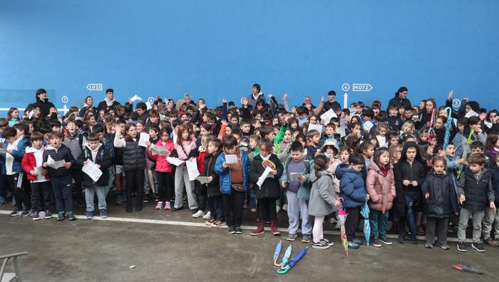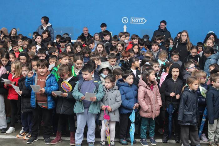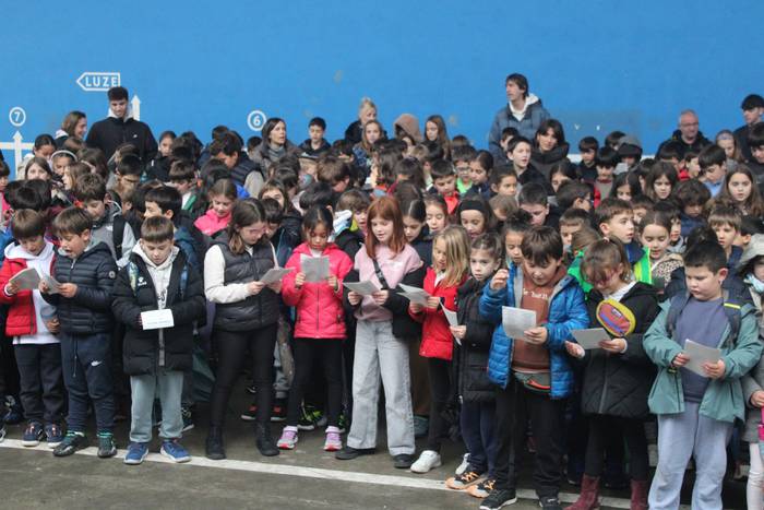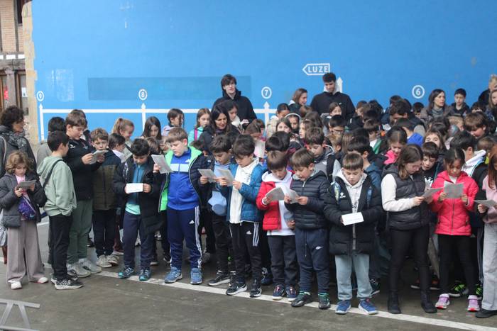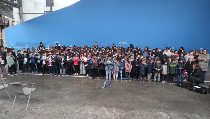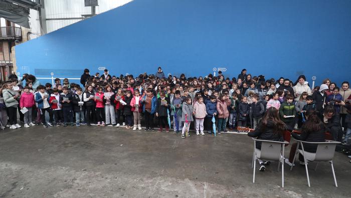 Ezohiko hitzordu horietako batean izan gara eguerdi partean. Izan ere, kantuan plazaratu dira LH zikloko hainbat ikasle eta irakasle Usurbilgo frontoira. Euskarari gorazarre ondo baino hobeto egin diote kantuan. Geure kantutegian ezagunak ditugun aspaldiko kantuak nahiz berriagoak egoki asko menderatuak dituztela argi utzi dute, gogotsu asko jendaurrean eskainitako kantaldian. Aterki azpian ziren hainbat guraso eta lagun hurbildu dira frontoira emanaldi hau ikustera.
