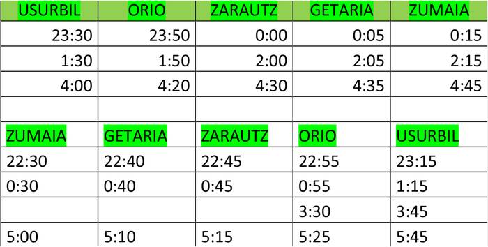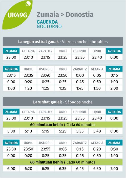 Asteburu honetan, ordea, gaurtik hasita astelehen goizaldera arte, ostiral, larunbat eta igande gauetan zerbitzua eskainiko du Lurraldebusek Usurbil eta Zumaia artean; zerbitzu bereziak ostiral eta igande gauetan, ohikoak larunbat gauean zehar. Segidan duzue zerbitzu horiei guztiei buruzko informazio zehatza. Xehetasun gehiago, lurrraldebus.eus atarian edo 900 300 340 telefono zenbakian jaso ahalko dituzue.