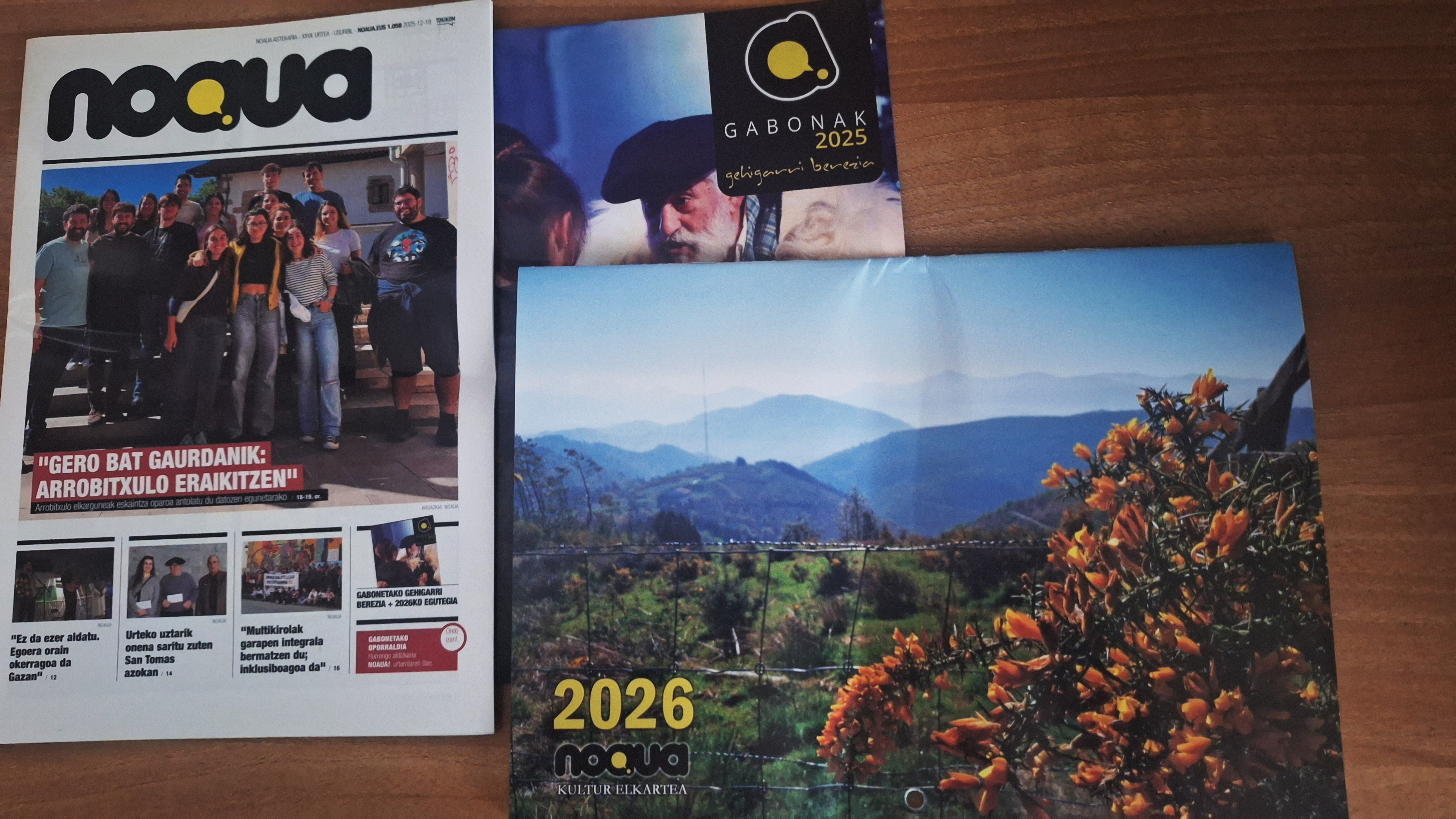 Postontzian jasoko zenuten honez gero, aste honetako NOAUA! aldizkaria. Ohi baino mardulagoa izan da. Hain zuzen, astekariarekin batera, gabonetako gehigarria eta 2026ko egutegia plazaratu ditugu. Horiexek izan dira, aurtengoari dagokionean, 2025eko azken argitalpenak. Hurrengo urtera arte, ez da astekari gehiago izango. Izan ere, abenduaren 26an eta urtarrilaren 2an ez dugu aldizkaririk kaleratuko. Datorren argitalpena, 1059. NOAUA! astekaria urtarrilaren 9an jasoko duzue. Zenbaki horri begirako oharrik baduzue, ohiko bideotatik helarazi ditzakezue: 943 360 321 telefono zenbakiaren nahiz elkartea@noaua.eus helbidera email bat bidalita.