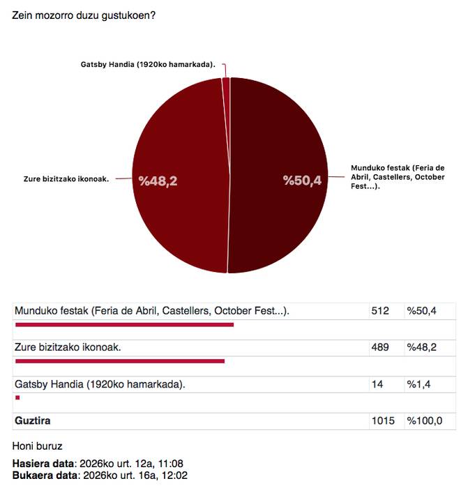 Grafika horretan dituzue emaitzak, hortxe botoen gehiengoak (%50,4ak) erabakitakoa. Munduko festak izango dira, hilabete barru, otsailaren 14an egingo den inauteri festarako hautaturiko mozorrotzeko gaia. Askotariko sorterrietako usadio, tradizio, festa, bizipen, pasadizo eta ospakizunen plaza izateko gonbita egina dago, beraz, NOAUA! Kultur Elkartetik. Gonbita halere, zuena da. Izan ere, aste hasieratik web orrialde honetan bertan martxan izan den inkestan parte hartutakook erabaki duzue, aurtengo inauterietarako mozorrotzeko gaia.