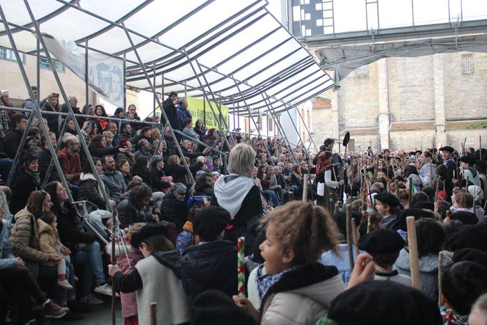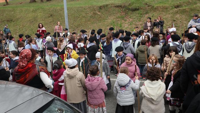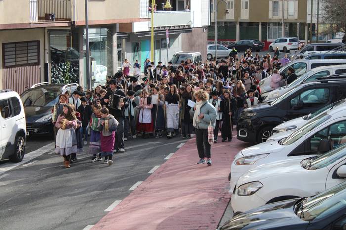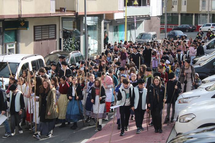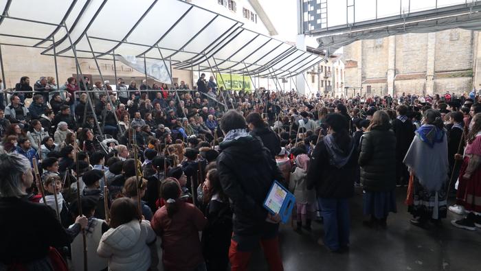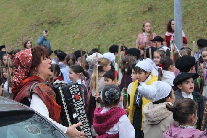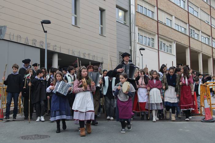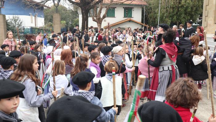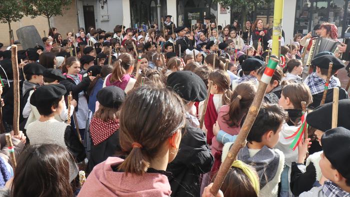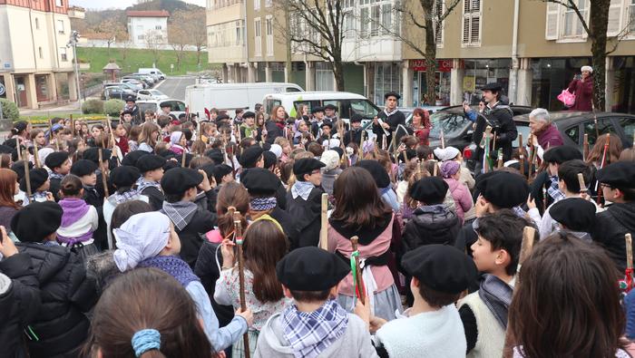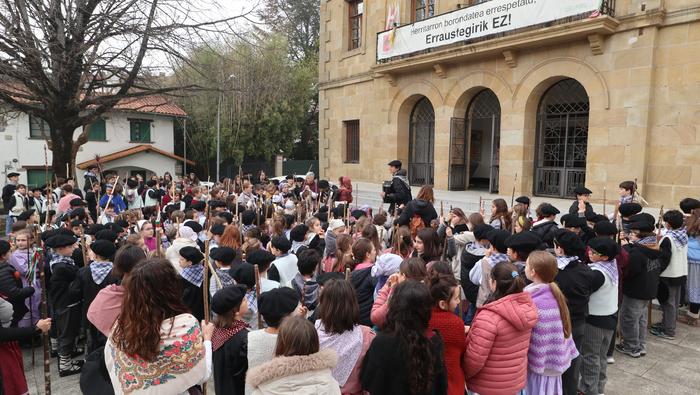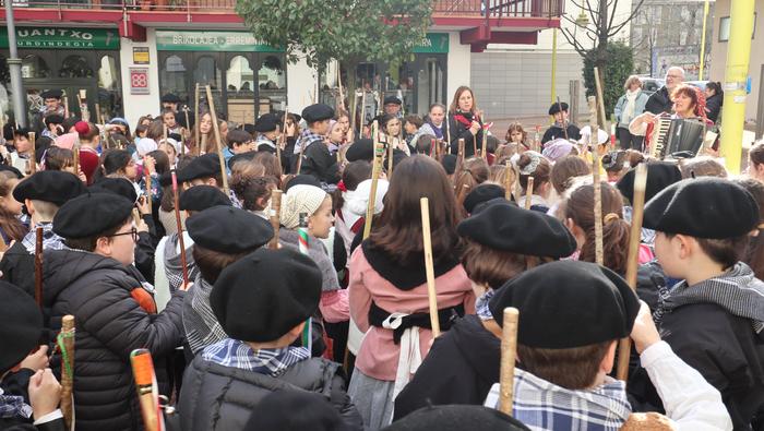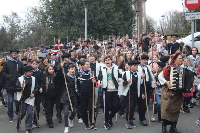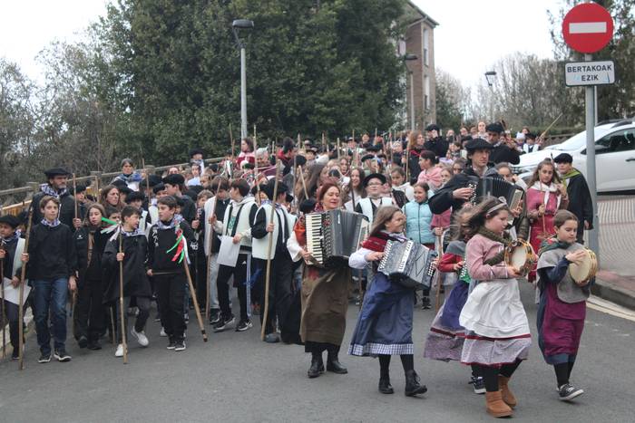Hala egin dute, ikastolako ikasleek eta irakasleok. Jaione Eskuderoren gidaritzapean, arratsaldeko 15:00ak aldera abiatu dira Agerialde paretik Atxegalden barrena. Auzoan bertan, udaletxe atarian, Askatasuna edota Sagardo plazetan aritu dira kantuan eta koplatan. Hainbat aldarri eta eskaera bildutako koplak gogoki kantatu dituzte. Eta zer esanik ez, makilarekin gogor egin diote lurrari deiadar, lozorrotik esnatzen hasi dadin.