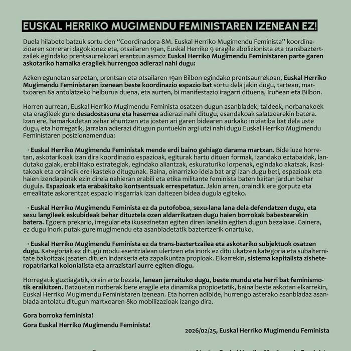 Desadostasuna eta haserrea agertu nahi izan dute Euskal Herriko Mugimendu Feministaren baitan diren askotariko eragileek, batetik, duela hilabete batzuk sortutako "Coordinadora 8m. Euskal Herriko Mugimendu Feminista" koordinazioaren nahiz hilaren 19an Euskal Herriko 9 eragile abolizionista eta transbaztertzaileek eginiko agerraldiaren aurrean. Horren harira, segidan duzuen adierazpena plazaratu dute eta horrekin bat egin dutenen artean dira, Usurbilgo Gazte Feministak taldekoak.