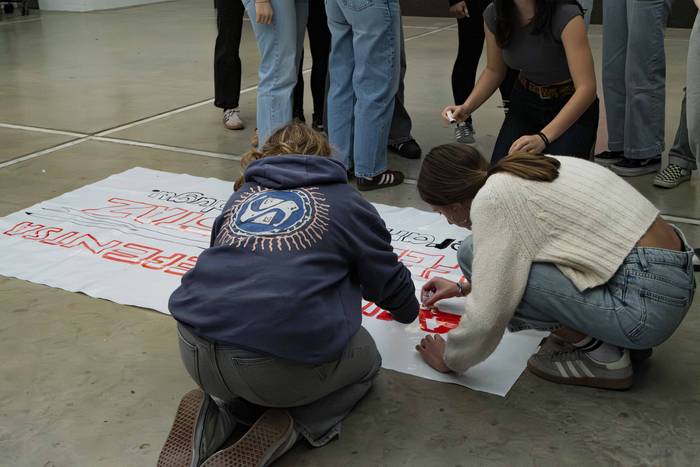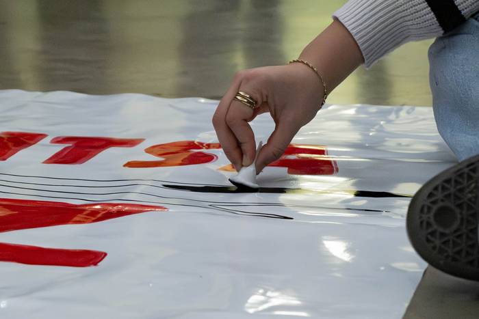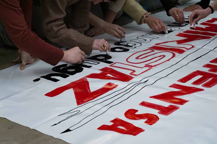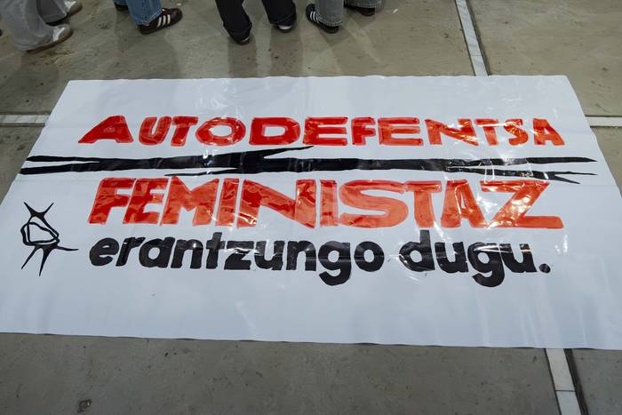Pankarta tailerra deitua zuten, Usurbilgo mugimendu feministak egunotarako antolaturiko ekintzen zikloaren baitan, iragarria zegoen moduan. Auzolanetik ondoko aldarridun baliabidea sortu dute, Martxoaren 8ko Emakumeen* Nazioarteko Egunera begirakoa. Mezu argi batekin osatu dute pankarta: "Autodefentsa feministaz erantzungo dugu".