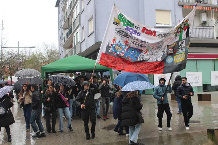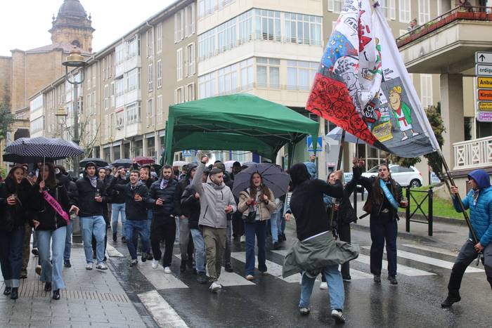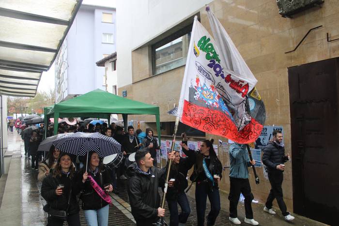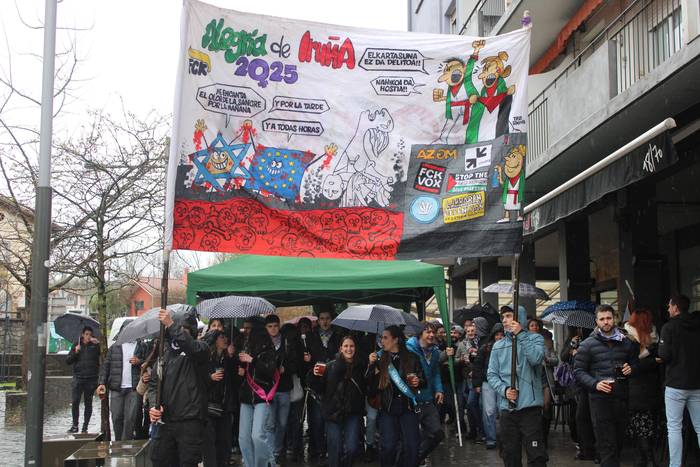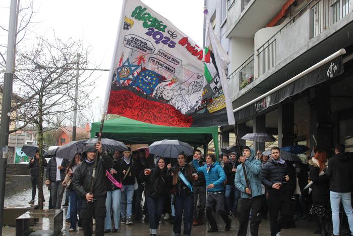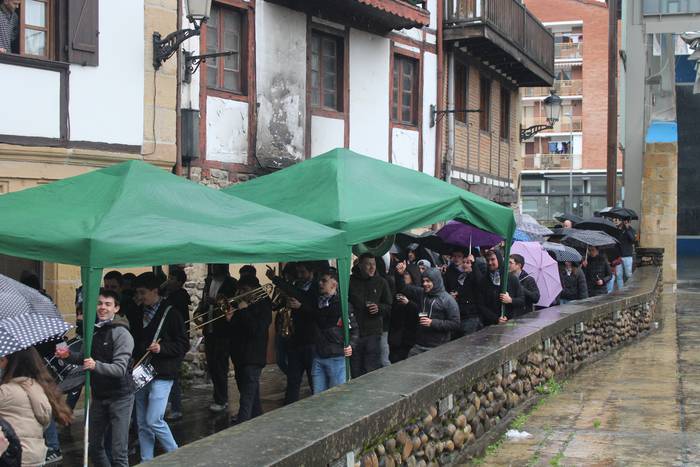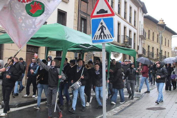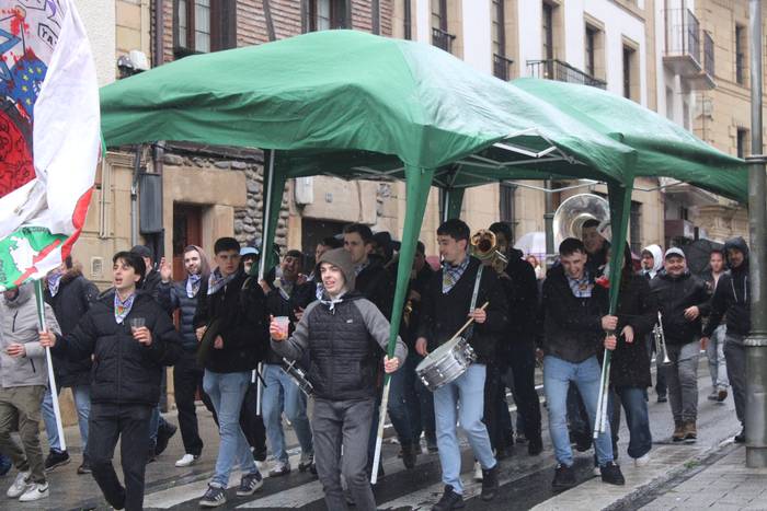 Larunbat eguerdi honetan egin dute lehen kalejira herrian barrena. Irudiok bazkaltzeko lekurantz eginiko bira amaierakoak dituzue. Taldearen izenari eta izenari oso estuki lotutako izanari gorazarre gogotik egin diete. Giro goibela jai giroan bilakarazi dute, urtero egin ohi duten moduan.
