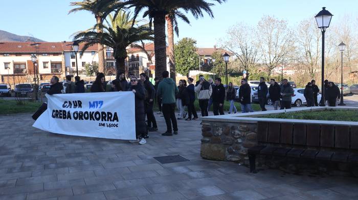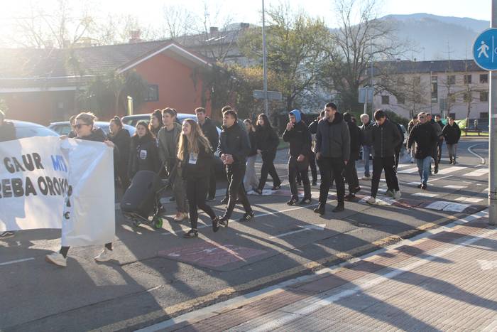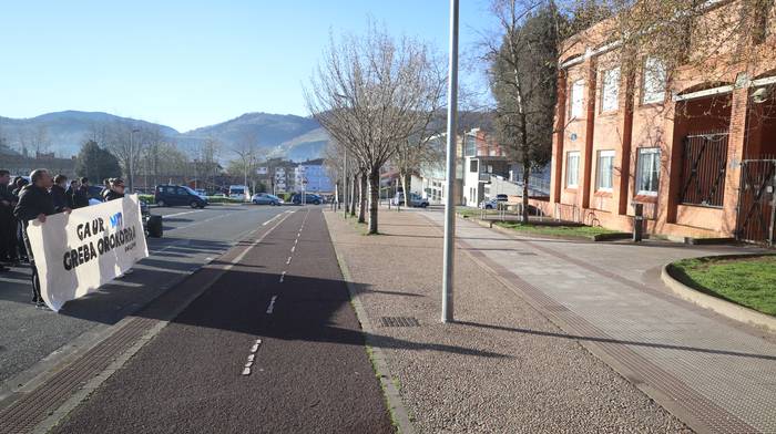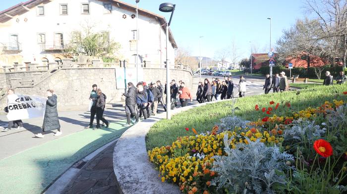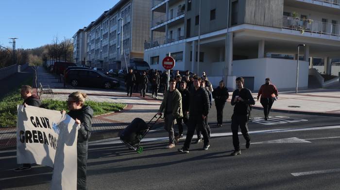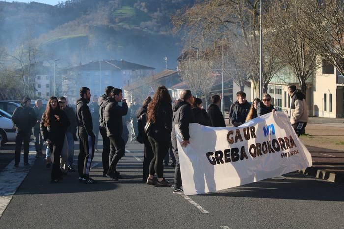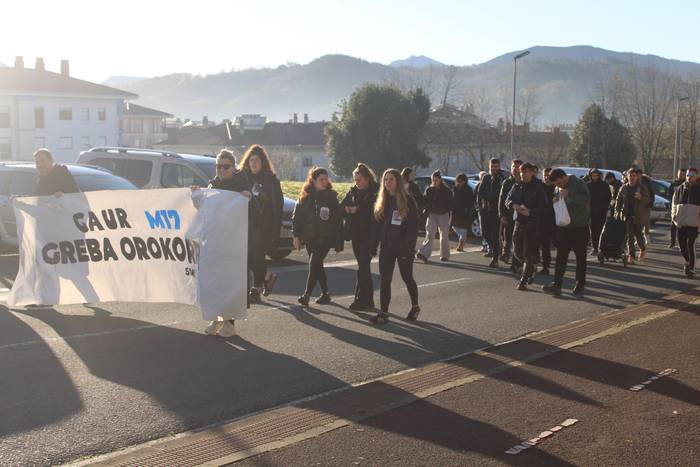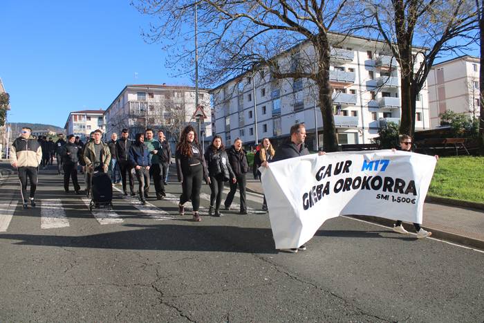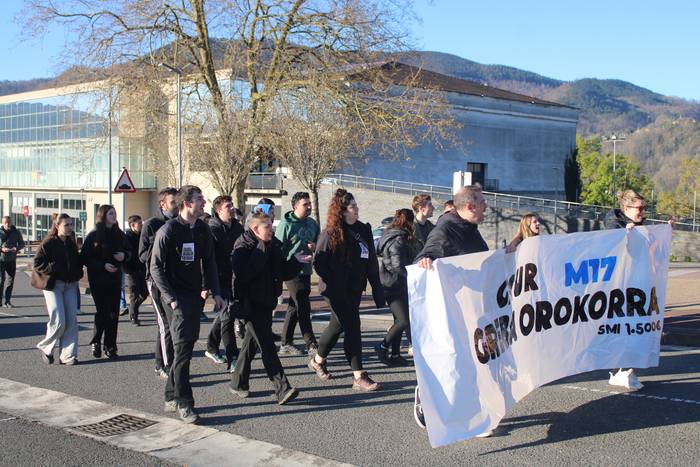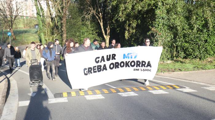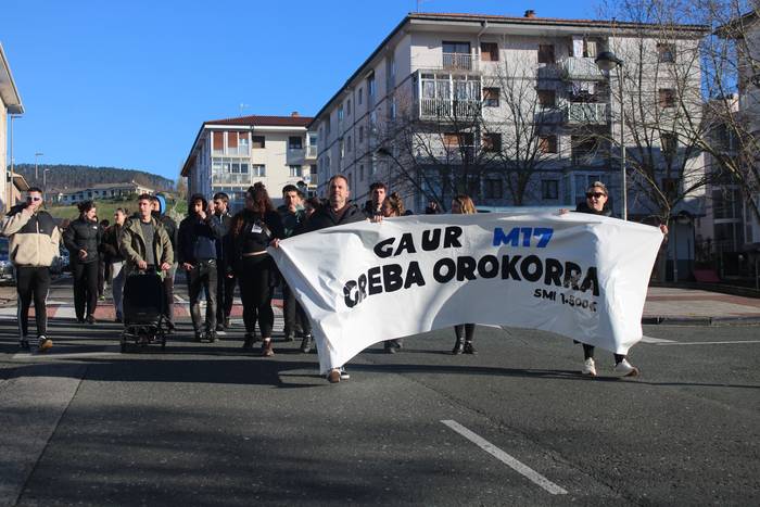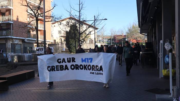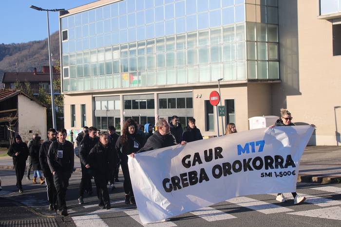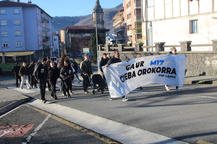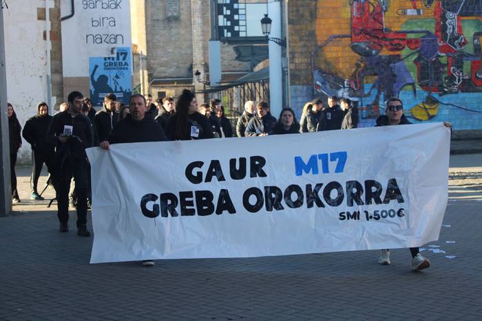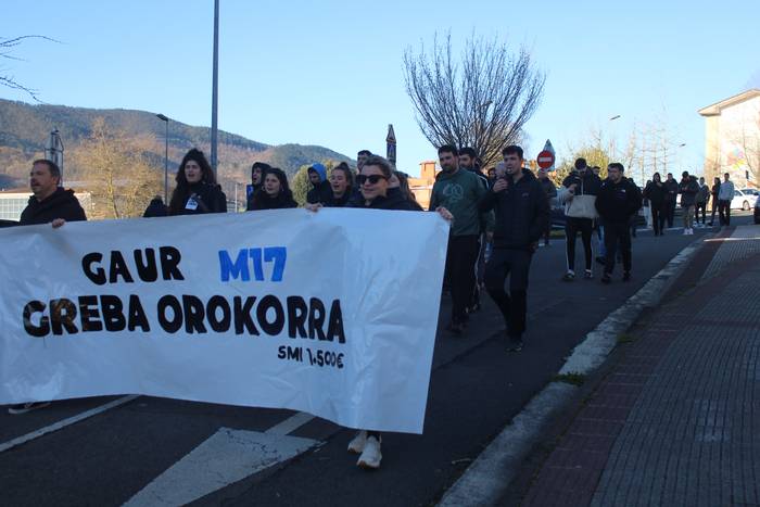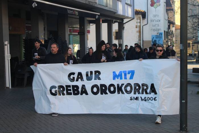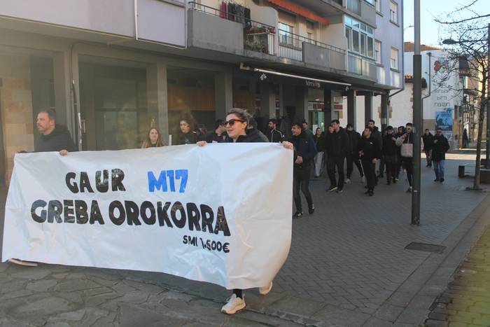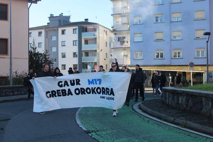"Gaur martxoak 17. Greba orokorra. LGS 1.500 euro" aldarripean, gaurko greba egun honetako manifestazioa egin dute herri erdigunean barrena. Goizeko 8:30etan abiatu da Mikel Laboa plazatik. Kalezarreraino igo eta buelta egin dute gero abiapuntura. Ibilbidean zehar, greba orokorrera batzeko aldarria entzun da behin eta berriz.
