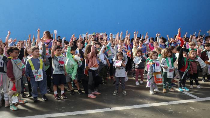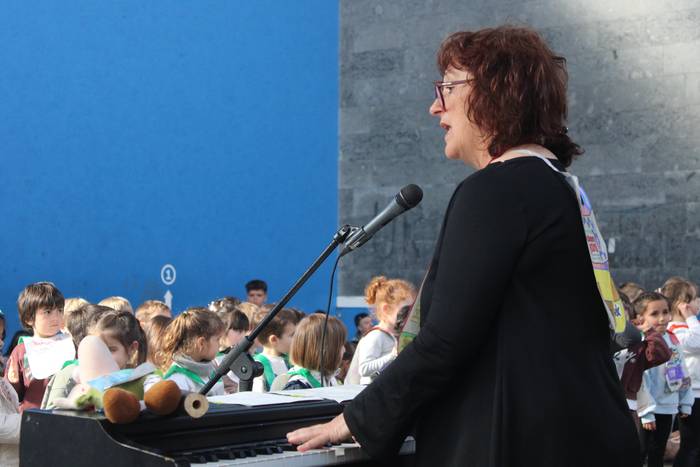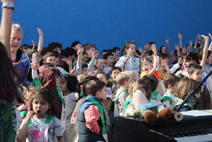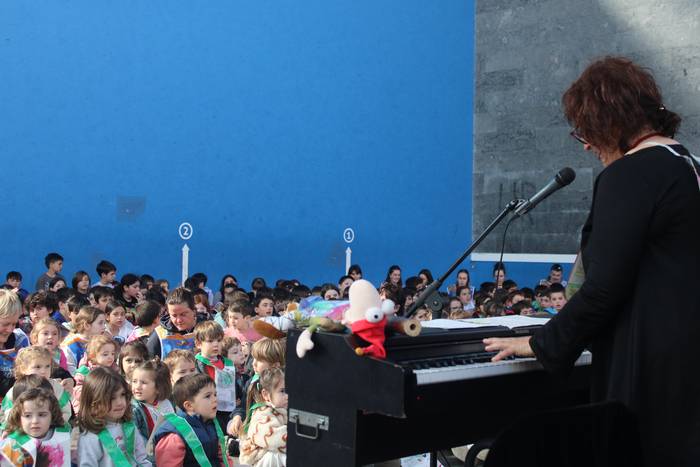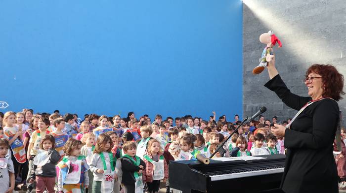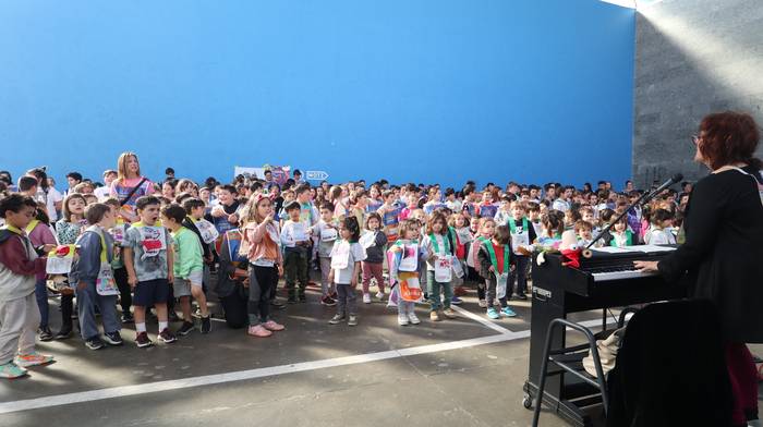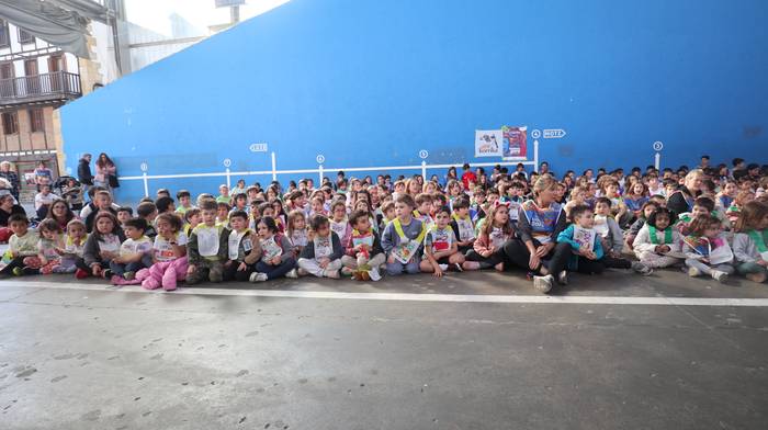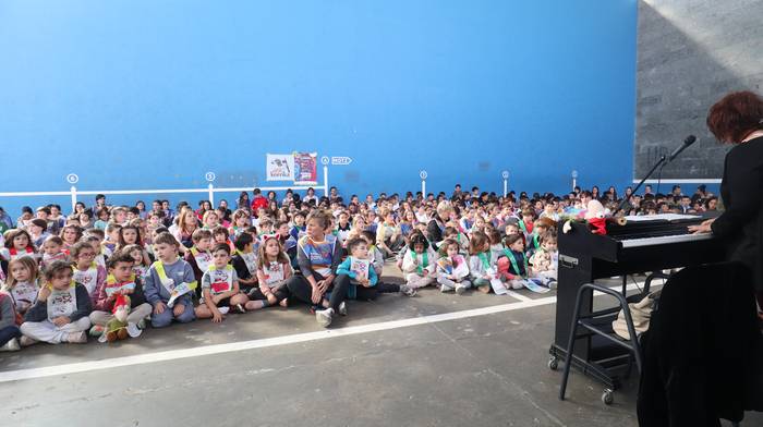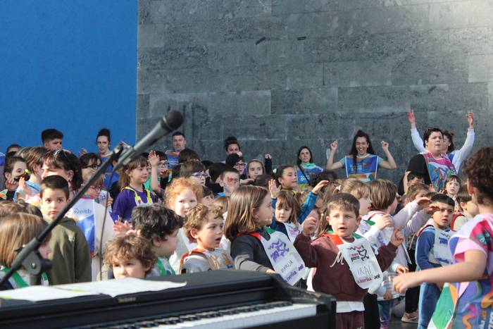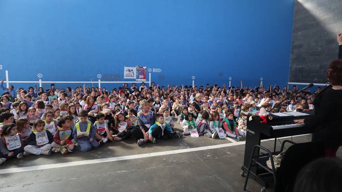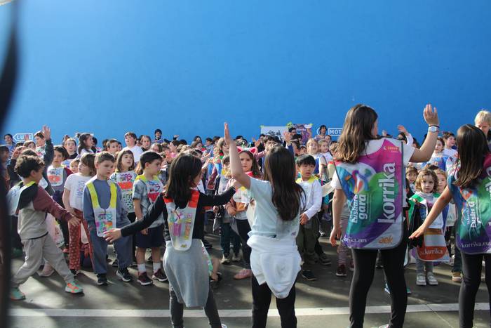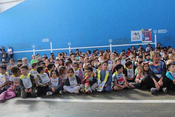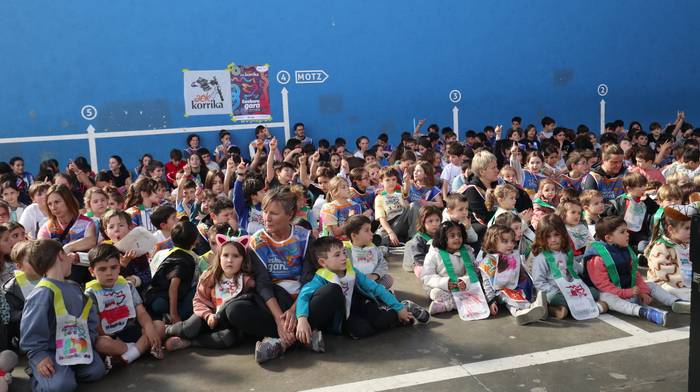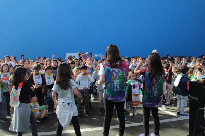 Dena eman dute, zuten guztia euskararen alde plazaratu eta herrian barrena lasterka egiteko. Euskararen aldeko deiadarra ez da itzaldu, helmugaratu direnean. Izan ere, astearte honetan, martxoaren 24an Udarregi ikastolak eginiko Korrika Txikia kantu giro ederrean borobildu dute herriko frontoian. Ezagunak ditugun abestiekin girotu dute unea. Denek bazuten lotune bat; euskarari gorazarre egindako sorkuntza lanak ditugu; tartean, azken egunotan maiz entzuten ari garen 24. Korrikaren abesti ofiziala. Kasu horretan, kantatu soilik ez, dantzan ere egin diote harrera herriko belaunaldi gazteenak.