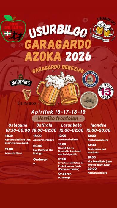 Aipatu moduan, bestalde, Garagardo Azoka antolatu du Usurbil Kirol Elkarteak aste honetarako, apirilaren 16tik 19ra. Egitaraua prest du eta jakinarazi du jada, segidan duzue. Musikaz eta nola ez, kirol ekintzekin girotuko dituzte lau azoka egunak.