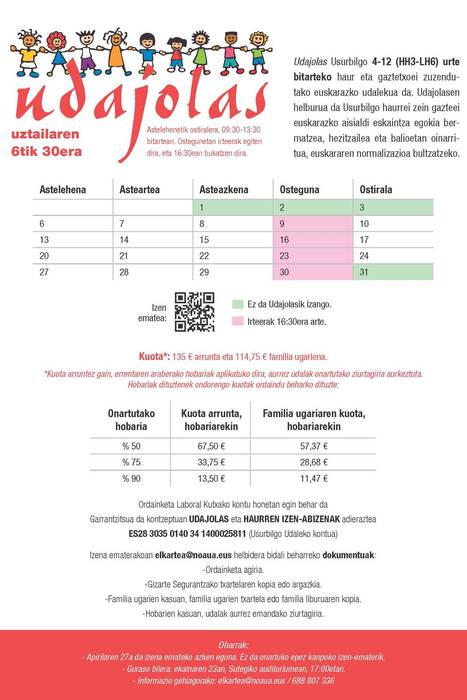 Adi, izen-ematea irekitzear baita. Ostegun honetan, apirilaren 16an hasi eta hilaren 27ra arteko epealdia izango dute interesdunek udalekuotan parte hartzeko tramitazioa bideratzeko. Ohi bezala, 4-12 urte artekoei zuzenduriko eskaintza izango da, HH3-LH 6 mailetan dabiltzanentzat. Aurten, Usurbilgo jaiak amaitu eta biharamunean hasiko da Udajolas, uztailaren 6an; amaitu, aldiz, hilaren 30ean. Ordura arte, astelehenetik ostiralera eskainiko da, goizez eta lau orduz, ohi bezala, 09:30-13:30 artean. Ostegunetan, txangoak egingo direnez, 16:30ak arte luzatuko da Udajolas.