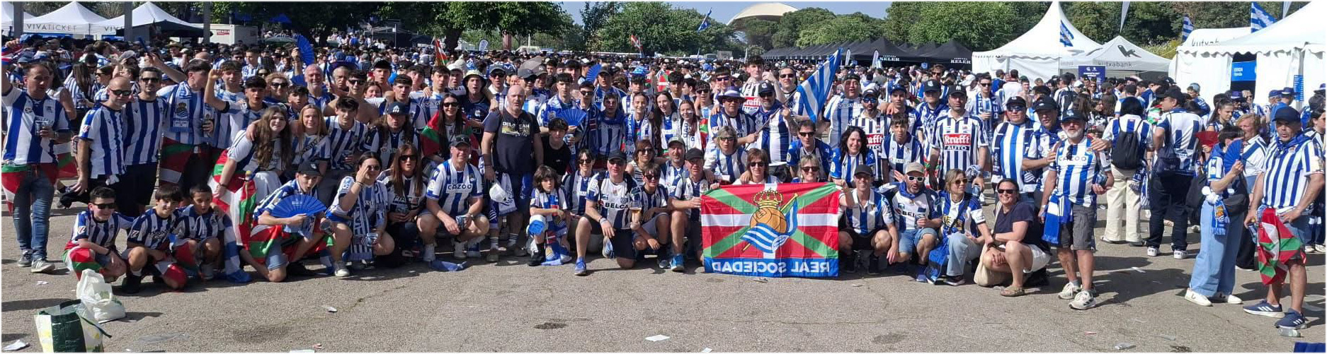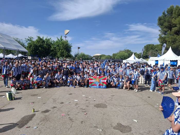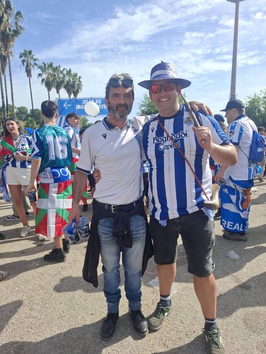 Gainezka egin dute zaletu txuri-urdinen guneek Euskal Herrian, nola ez Donostian eta Gipuzkoako hainbat udalerrietan bereziki, baita askorentzat asteburu honetako arreta gune nagusia den Sevillan ere. Zaletuen gunea egokitu dute bertan gure artetik joandakoentzat. Handik heldutakoak dira hain zuzen, larunbat arratsalde honetan zehar atera dituzten zenbait argazki; zehazki bi.