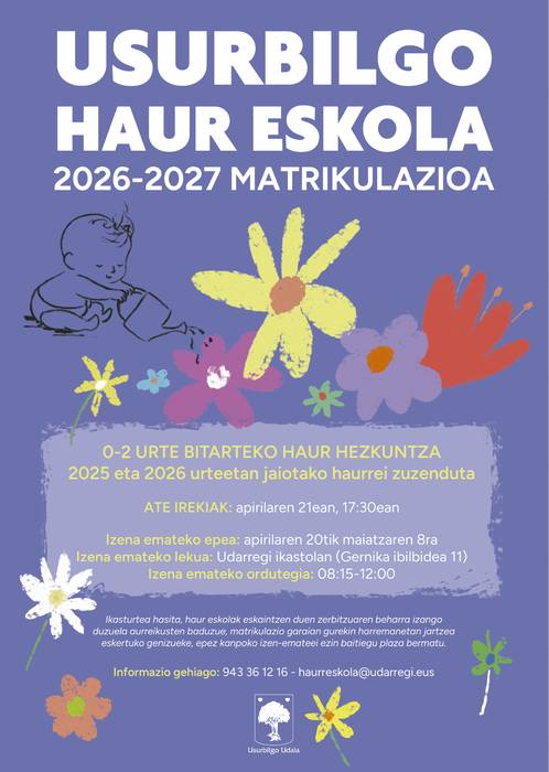 Zabalik izango da maiatzaren 8ra arte, datozen hiru asteotan beraz, 2026-27 ikasturterako haur eskolan matrikulatzeko epealdia. Udarregi ikastolan bideratu beharko da, Gernika ibilbidea 11n. "Familiek izen ematea Usurbilgo Udalaren eskaera inprimakia betez egin ahal izango dute". Informazio gehiago, bideotatik jaso ahalko duzue: 943 36 12 16 telefono zenbakian edo haurreskola@udarregi.eus helbidean.