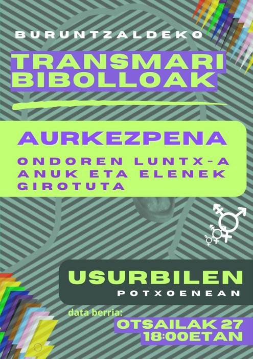 Ordua: 18:00.Tokia: Potxoenea.Zehaztasunak: Buruntzaldeko transmaribibolloek aurkezpen ekitaldia antolatu dute. Ondoren, Anukek eta Elenek giroturiko luntxa izango da.Antolatzaileak: Buruntzaldeko transmaribibolloak.