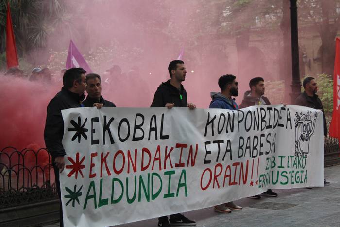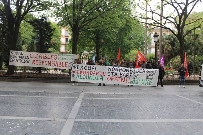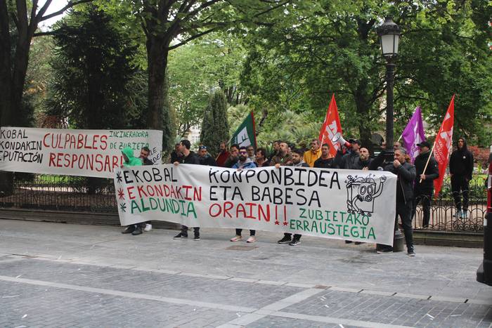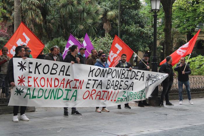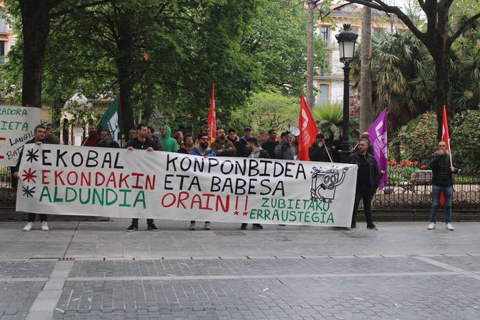 Goizeko 10:30eak ingurutik ordubete pasatxoko iraupeneko elkarretaratzea egin dute Foru Aldundiko egoitzari begira, aipatu Gipuzkoa plazan, "Ekobal, Ekondakin, Aldundia, konponbidea eta babesa orain!" aldarripean.