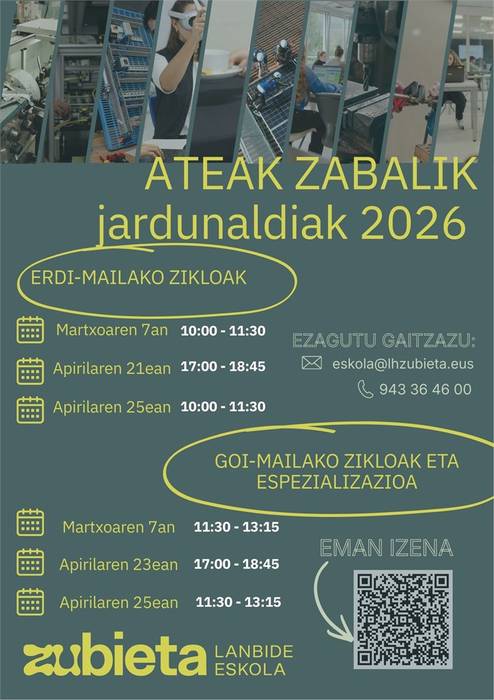 "Hemen daude 2026-27 ikasturterako ate irekien jardunaldiak", Zubieta Lanbide Eskolatik jakinarazi dutenez. Hurrengo ikasturtera begirako matrikulazio garaia heldu aurretik, ikastetxeko azpiegiturak nahiz egitasmoa bera ezagutzea ahalbidetuko dute, egunotarako antolaturiko ate irekien saioek. Guztira hiru jardunaldi egun finkatu dituzte, abiatu berri dugun aste honetarako.
